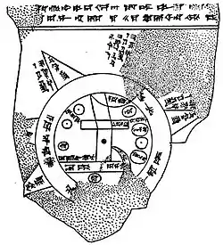 ![]() | 1. "Montagne" (akkadien : šá-du-ú) 2. "Cité" (akkadien : uru) 3. Urartu (akkadien : ú-ra-áš-tu) 4. Assyrie (akkadien : kuraš+šurki) 5. Der (akkadien : dēr) 6. ? 7. Marécage (akkadien : ap-pa-ru) 8. Elam (akkadien : šuša) 9. Canal (akkadien : bit-qu) 10. Bit Yakin (akkadien : bῑt-ia-᾿-ki-nu) | 11. "Cité" (akkadien : uru) 12. Habban (akkadien : ha-ab-ban) 13. Babylone (akkadien : tin.tirki), coupée par l'Euphrate 14 — 17. Océan (eau salée, akkadien : idmar-ra-tum) 18 — 22. Objets mythologiques |