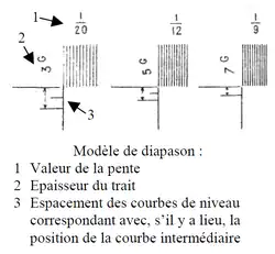 La loi du quart réglant les questions de l’espacement et de la longueur des hachures, reste à traiter de leur épaisseur. Un diapason permet à l’exécutant de disposer à tout instant d’un modèle de hachures type, conçu de telle sorte que l’intensité de la teinte soit proportionnelle à la pente.