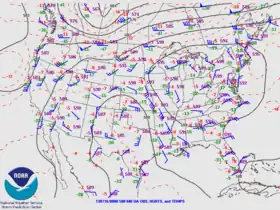 Comme dans le cas des rapports en surface, toutes ces données vont être pointées sur des cartes météorologiques. Celles-ci sont tracées à des niveaux de pression constants, appelés surfaces isobares type, et c'est la hauteur du géopotentiel (la hauteur du niveau de pression au-dessus du niveau de la mer) qui sera indiqué[21]. Chaque information est pointée selon un modèle similaire à celui des stations de surface.