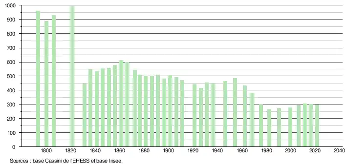 L'évolution du nombre d'habitants est connue à travers les recensements de la population effectués dans la commune depuis 1793. Pour les communes de moins de 10 000 habitants, une enquête de recensement portant sur toute la population est réalisée tous les cinq ans, les populations légales des années intermédiaires étant quant à elles estimées par interpolation ou extrapolation[27]. Pour la commune, le premier recensement exhaustif entrant dans le cadre du nouveau dispositif a été réalisé en 2006[28].
