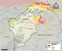 Le retrait-gonflement des sols argileux est susceptible d'engendrer des dommages importants aux bâtiments en cas d’alternance de périodes de sécheresse et de pluie. 14,8 % de la superficie communale est en aléa moyen ou fort (75,2 % au niveau départemental et 48,5 % au niveau national). Sur les 178 bâtiments dénombrés sur la commune en 2019, 175 sont en aléa moyen ou fort, soit 98 %, à comparer aux 94 % au niveau départemental et 54 % au niveau national. Une cartographie de l'exposition du territoire national au retrait gonflement des sols argileux est disponible sur le site du BRGM[26],[Carte 3].