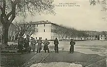 La porte d'entrée monumentale est conservée ; elle est inscrite au titre des monuments historiques en 1926[1]. Elle est l'œuvre du sculpteur aixois Joseph Pellegrin. Elle est surmontée d'un bas-relief représentant deux anges portant un blason à triple lys surplombé d'un angelot tenant une couronne, sur fond de symboles militaires. On peut lire au-dessus de la porte l'inscription « La liberté ou la mort ». Deux petits canons sont scellés au pied de chaque côté.