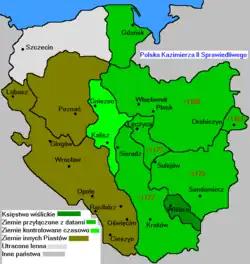 Casimir II le Juste, né en 1138 après la mort de son père[1],[2] était donc absent sur le testament rédigé par Boleslas III et ne reçoit rien en héritage.