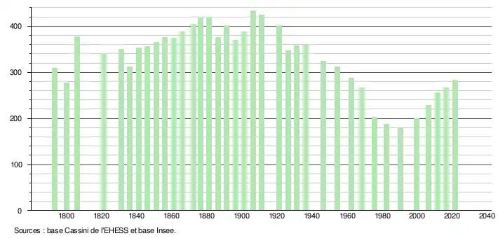 L'évolution du nombre d'habitants est connue à travers les recensements de la population effectués dans la commune depuis 1793. Pour les communes de moins de 10 000 habitants, une enquête de recensement portant sur toute la population est réalisée tous les cinq ans, les populations légales des années intermédiaires étant quant à elles estimées par interpolation ou extrapolation[32]. Pour la commune, le premier recensement exhaustif entrant dans le cadre du nouveau dispositif a été réalisé en 2006[33].