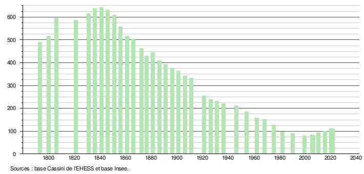 L'évolution du nombre d'habitants est connue à travers les recensements de la population effectués dans la commune depuis 1793. Pour les communes de moins de 10 000 habitants, une enquête de recensement portant sur toute la population est réalisée tous les cinq ans, les populations légales des années intermédiaires étant quant à elles estimées par interpolation ou extrapolation[38]. Pour la commune, le premier recensement exhaustif entrant dans le cadre du nouveau dispositif a été réalisé en 2005[39].