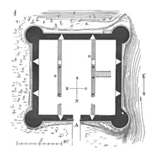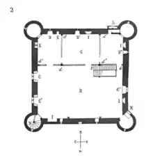 Le manoir de Saint-Médard est bâti sur la rive droite du ruisseau qui, sur ce point, s'étend et forme un marécage. Un fossé large entourait cette habitation fortifiée, dont nous donnons le plan au niveau du rez-de-chaussée (1). Ce plan est tracé sur un carré avec quatre tourelles aux angles. La porte est en A, et deux meurtrières s'ouvrent, à rez-de-chaussée dont le sol est peu élevé au-dessus du marécage, sur chacune des faces du carré. Dans l'origine, cette enceinte carrée enveloppait une construction de bois dont on voit les scellements sur les parois intérieures. À la place des deux murs O,O, d'une époque plus récente, il y avait quatre gros poteaux de bois qui portaient le plancher du premier, des cloisons et un pan de bois de refend. Un escalier de bois permettait de monter au premier étage. Ce rez-de-chaussée du sol au plafond n'a pas plus de 2m, 65.