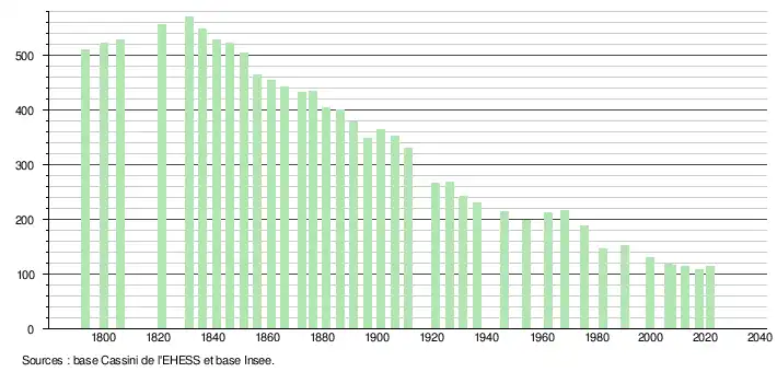 L'évolution du nombre d'habitants est connue à travers les recensements de la population effectués dans la commune depuis 1793. Pour les communes de moins de 10 000 habitants, une enquête de recensement portant sur toute la population est réalisée tous les cinq ans, les populations légales des années intermédiaires étant quant à elles estimées par interpolation ou extrapolation[31]. Pour la commune, le premier recensement exhaustif entrant dans le cadre du nouveau dispositif a été réalisé en 2007[32].