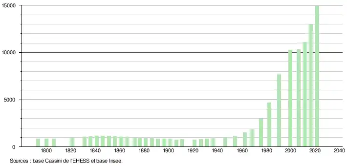 5. Par convention dans Wikipédia, le principe a été retenu de n’afficher dans le tableau des recensements et le graphique, pour les populations légales postérieures à 1999, que les populations correspondant à une enquête exhaustive de recensement pour les communes de moins de 10 000 habitants, et que les populations des années 2006, 2011, 2016, etc. pour les communes de plus de 10 000 habitants, ainsi que la dernière population légale publiée par l’Insee pour l'ensemble des communes.