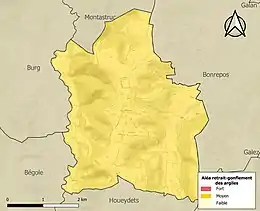 Le retrait-gonflement des sols argileux est susceptible d'engendrer des dommages importants aux bâtiments en cas d’alternance de périodes de sécheresse et de pluie. La totalité de la commune est en aléa moyen ou fort (44,5 % au niveau départemental et 48,5 % au niveau national). Sur les 66 bâtiments dénombrés sur la commune en 2019, 66 sont en aléa moyen ou fort, soit 100 %, à comparer aux 75 % au niveau départemental et 54 % au niveau national. Une cartographie de l'exposition du territoire national au retrait gonflement des sols argileux est disponible sur le site du BRGM[22],[Carte 3].
