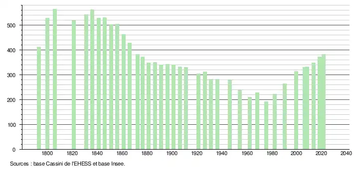 L'évolution du nombre d'habitants est connue à travers les recensements de la population effectués dans la commune depuis 1793. Pour les communes de moins de 10 000 habitants, une enquête de recensement portant sur toute la population est réalisée tous les cinq ans, les populations légales des années intermédiaires étant quant à elles estimées par interpolation ou extrapolation[23]. Pour la commune, le premier recensement exhaustif entrant dans le cadre du nouveau dispositif a été réalisé en 2008[24].