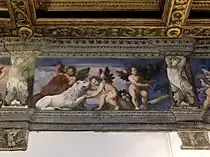 Il y a l'épisode de Judith et Holopherne, un concert de flûte, le meurtre de Virginie et le suicide de Lucrèce raconté par Tite-Live, la représentation des Charites, le suicide de Cléopâtre à l'aspic, raconté par Plutarque, Samson qui subit la coupe de cheveux de Dalila, un concert country, la représentation de Vénus et Cupidon. À ces scènes s'ajoute, dans la voûte près de l'escalier, le rat de Ganymède entouré de putti surpris dans des poses insolites. Entouré des personnifications des 4 saisons (prinyemps-Floro, été-Pomone, automne-Bacchus, hiver-Saturne), dans le grand panneau central de la voûte, en position dominante, on retrouve la scène vertigineuse de Phaeton incapable de contrôler les chevaux sauvages qui traînent le Char solaire. Le père inquiet de Phaéton, Apollon, et sa sœur Séléné qui tourne son regard, sont représentés au centre de lunettes, de part et d'autre de la voûte, qui rappelle le ciel avec son fond bleu. La décoration est complétée par des hommes nus dont la chair rosée se détache sur le fond bleu du ciel, qui, à leurs manières, se réfère au plafond voûté de Michel-Ange nu de Sixtine.