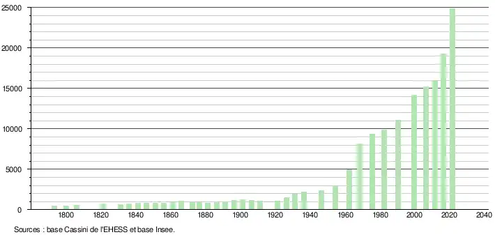 - Par convention dans Wikipédia, le principe a été retenu de n’afficher dans le tableau des recensements et le graphique, pour les populations légales postérieures à 1999, que les populations correspondant à une enquête exhaustive de recensement pour les communes de moins de 10 000 habitants, et que les populations des années 2006, 2011, 2016, etc. pour les communes de plus de 10 000 habitants, ainsi que la dernière population légale publiée par l’Insee pour l'ensemble des communes.