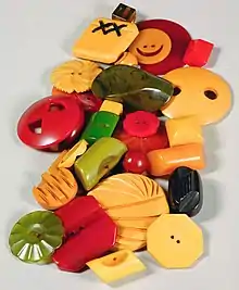Catalin a été utilisé des années 1930 aux années 1950 pour de nombreux objets ménagers, bijoux, petites boîtes, lampes, manches de couverts et ensembles de bureau. Les bijoux Catalin, plus communément appelés à tort bijoux en bakélite, ont été fabriqués des années 1930 jusqu'à la fin de la Seconde Guerre mondiale, lorsqu'ils sont devenus trop chers, car chaque pièce devait être moulée et polie individuellement. L'American Catalin Corporation a introduit 15 nouvelles couleurs en 1927 et développé des techniques pour créer des marbrures. Les couleurs comprenaient le jaune, l'orange, le rouge, les verts, le bleu et le violet, avec des versions claires, opaques et marbrées. Dans les années 1930, les bijoux fabriqués dans ces couleurs étaient populaires avec des ensembles de perles, de bracelets, de boucles d'oreilles et de bagues portés ensemble.