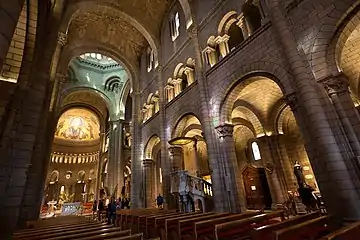 Les vitraux des fenêtres hautes de la nef montrent des femmes de l'Ancien Testament et ceux des nefs latérales représentent des scènes de la vie de Jésus et de Marie.