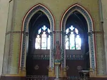 Une galerie moderne à arcatures tréflées borde le toit de la nef.