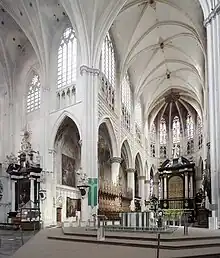 La construction de l'église a commencé peu après 1200 ; elle a été consacrée en 1312, dès qu'une partie est devenue utilisable. À partir de 1324, les arcs-boutants et la structure du chœur sont construits selon des caractéristiques gothiques brabançonnes, différentes du gothique français. Après l'incendie de la ville en 1342, le maître-maçon Jean d'Oisy dirige les réparations et poursuit la deuxième phase de construction jusqu'à sa mort en 1375. Ses successeurs achèvent les voûtes de la nef vers 1437 et celles du chœur vers 1451[1],[2],[3],[4].