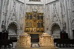 Le majestueux retable en bois polychrome et doré fut réalisé par Petit Jean sous la direction d'Enrique Egas et de Pedro de Gumiel. Sa construction dura six ans (1498-1504) et de grands sculpteurs comme Felipe de Bigamy, Diego Copin et Sebastian Almonacid y travaillèrent. La dorure et la polychromie sont l'œuvre de Francisco de Amberes et de Juan de Borgona. Ce retable se divise en trois corps composés de cinq rangées verticales dont deux plus étroites aux extrémités à la mode des auvents et à sa base, une grande prédelle. Au centre, dans la partie inférieure du retable, se loge le tabernacle, chef-d'œuvre de filigrane en bois doré. Le parvis du retable est surmonté par un calvaire de grande dimension entouré d'un ciel étoilé.