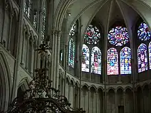 En 1235 cependant, à la suite de l'épiscopat d'Henri de Villeneuve (1220-1234), le gros œuvre du chœur était terminé[6]. On débuta dès lors la pose des vitraux du déambulatoire, laquelle ne se termina que vers 1250. Les travaux de la façade occidentale et de la nef démarrèrent alors, mais très lentement.