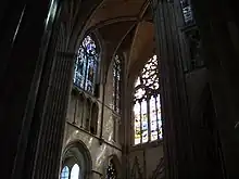 La culée du quatrième arc-boutant de la nef, juste avant le transept, soutient deux arcs-boutants, l'un soutenant la nef et l'autre le transept. Entre les culées, les fenêtres des chapelles latérales ont presque chacune une forme et une taille différente.