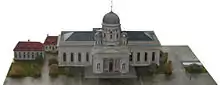 La façade comportait un corps central massif accessible par quelques marches. Le porche proéminent est porté par deux colonnes ioniques surmontées d'un fronton triangulaire imposant sans décoration à l'intérieur.