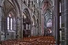 La hauteur s'élève à 20,2 mètres sous voûte dans la nef (20,5 mètres dans le chœur). Les croisillons du transept ont tous deux une longueur de 9,9 mètres. Les piliers sont formés d'un fût principal, reste probable de l'ancien édifice et de quatre colonnes secondaires qui ont servi à consolider les arcades en y ajoutant de nouveaux arceaux. Les voûtes sur croisées d'ogives ont toutes leurs clefs ornées de feuillage.