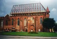 La cathédrale avait à l'origine deux flèches. Les flèches (une au nord et une au sud) en vis à vis au niveau de l'entrée (côté ouest) de la cathédrale. En 1544, les deux flèches ont été détruites par le feu. Le clocher sud a été reconstruit, mais la flèche nord a été remplacée par un toit à simple pignon. En 1640, une horloge a été installée sous le clocher reconstruit, et à partir de 1650 la bibliothèque Wallenrodt, donnée par Martin von Wallenrodt, était située sous le toit à deux versants.