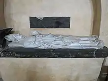 Un certain nombre de personnes reposent dans la cathédrale. Le gisant visible dans la nef appartient à Guillaume Ouvrouin, évêque de Rennes mort en 1347. Le tombeau se trouvait à l'origine dans un cimetière, et il n'a été transféré dans la cathédrale qu'en 1808. L'enfeu qu'il occupe contenait auparavant les restes d'un couple de bourgeois lavallois du XIVe siècle[4].