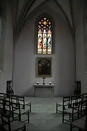 L'abside romane du chœur oriental est transformée et agrandie en 1330 en un chœur de style gothique rayonnant avec fenêtres à meneaux. Les vitraux, qui pour une grande part sont d'origine, sont remarquables. Ils représentent la parabole des vierges folles et des vierges sages, et les prophètes. Quant à ceux représentant la Passion, les scènes de la vie de la Vierge et les apôtres avec les prophètes, ils datent du premier tiers du XVe siècle.