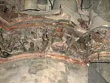- Une peinture très effacée sur le mur du croisillon nord du transept roman (juste derrière la porte d'entrée située au nord).