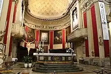 Au-delà de la croix , dans l'alignement de la nef centrale , se trouve l'abside profonde, avec une terminaison semi-circulaire caractérisée par un bassin richement décoré de caissons en stuc. L'ensemble de l'espace est occupé par le chœur, surélevé de quelques marches par rapport au reste de l'église[22].
