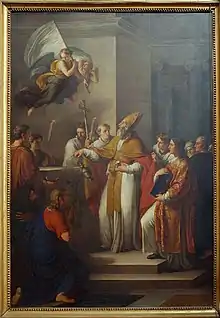 À l'origine, la contre-façade de la nef centrale était ornée d'une grande toile représentant le Banquet du roi Assuérus (1620)[23], lié aux événements relatés dans le Livre d'Esther ; le grand tableau, œuvre du Ferrarais Carlo Bononi , se trouve sur la contre-façade de l'église San Giovanni Evangelista de Ravenne, du réfectoire du couvent dont il provient[24].