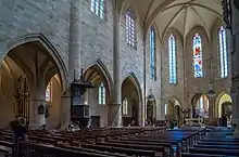 Quoique réutilisant certaines parties romanes de l'ancienne abbatiale, le style général de la cathédrale est gothique d'inspiration nordique (présence de deux vaisseaux collatéraux).