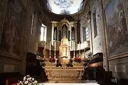 L'autel principal est de 1765, surmonté d'un ciborium octogonal d'Orazio Grassi. Sur les murs sont visibles deux grands tableaux de Coghetti représentants Jules II inaugurant la basilique Saint-Pierre et Sixte IV bénissant la flotte contre les Turcs. Le chœur en bois incrusté construit entre 1500 et 1521 est particulièrement remarquable. La chaire en provenance de l'ancienne cathédrale, remonte à la première moitié du XVIe siècle et a une forme hexagonale.