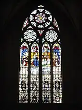 Le chœur fut orné de vitraux commandés par l'évêque Roger de Mercy en 1235, ces vitraux représentent des scènes bibliques ou de la vie de saint et furent déplacés dans les absidioles attenantes au chœur au XIXe siècle à la suite de la conception de nouveaux vitraux par Casimir de Balthazar de Gachéo. Ce dernier composa de beaux vitraux pour habiller les trois fenêtres à doubles lancettes de 26 mètres de haut éclairant le chœur : dans un style historiciste, l'artiste présente 14 scènes de la vie du Christ dans la verrière centrale ; des scènes de l'Ancien Testament dans celle de gauche ; des épisodes clefs de la vie de l'Église dans cette de droite.