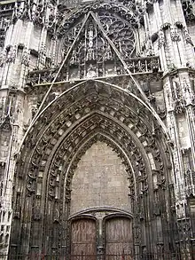 Au début du XVIe siècle, le chapitre décide de reconsidérer le projet de façade occidentale établi par Jehançon Garnache. Pour ce faire, il fait appel en 1506, date où débute l'édification de la basilique Saint-Pierre de Rome, à un nouvel architecte, Martin Chambiges[5]. La construction débute l'année suivante[SB 6]. Le nouveau projet prévoit une façade qui forme un bloc de deux travées et qui comporte trois porches séparés par des contreforts dans la tradition des cathédrales du XIIIe siècle, comme la cathédrale Notre-Dame de Reims, mais avec une décoration caractéristique du XVIe siècle[SB 6]. En 1519, l'architecte Jean de Soissons prend le relai de Martin Chambiges[6]. Le rez-de-chaussée est terminé en 1527 et les portes sont installées en 1530[6].