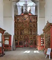 Le premier niveau présente à l'intérieur une collection unique de ciels provenant d'églises et de chapelles du raïon Kargopolski. Au deuxième niveau a été conservé une iconostase sculptée à cinq rangées, datant de la seconde moitié du XVIIIe siècle, ainsi qu'un fragment de fresque datant du Moyen Âge.