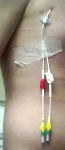Les complications potentielles du placement d'un tel cathéter comprennent l'hémorragie et un pneumothorax lors de l'insertion et la thrombose ou une infection à un stade ultérieur. Les patients avec une cathéter tunnelisé nécessitent donc un rincement périodiques de celui-ci avec de l'héparine, pour éviter qu'il ne soit bouché par des caillots de sang.