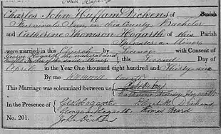 Catherine Hogarth et Charles Dickens se marient donc le en l'église St. Luke's de Chelsea[22]. Le mariage est célébré dans la discrétion ; avec « ses airs de fillette »[23], la jeune Catherine fait une mariée modeste. Un invité la trouve « radieuse, aimable […], vêtue de la manière la plus simple et soignée qui soit, et sans doute plus jolie ainsi que si on lui avait permis de s’apprêter davantage »[23]. Les jeunes mariés passent leur lune de miel à Chalk, à l'extrême est de Gravesend dans le Kent, pas très loin de Chatham, avant de rejoindre le logement de célibataire dont dispose Dickens à Furnival's Inns, puis de s'installer à Bloomsbury, au centre-nord de Londres. C'est la forge de Chalk que Dickens a prise comme modèle pour l'atelier où travaille Joe Gargery, le bienveillant oncle de Pip dans Les Grandes Espérances, et c'est là qu'il a écrit les premières livraisons de ses Pickwick Papers[24],[25].