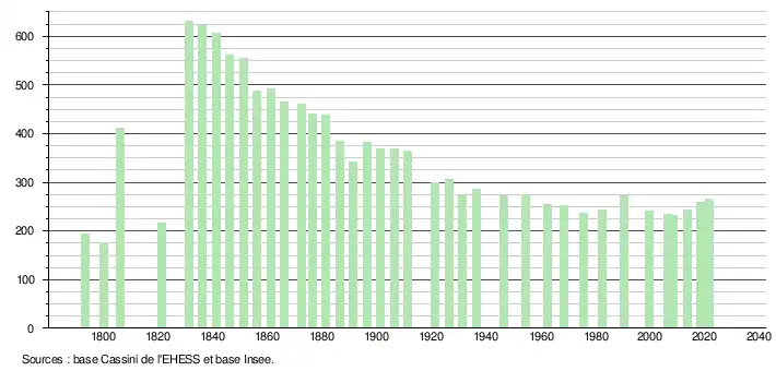 L'évolution du nombre d'habitants est connue à travers les recensements de la population effectués dans la commune depuis 1793. Pour les communes de moins de 10 000 habitants, une enquête de recensement portant sur toute la population est réalisée tous les cinq ans, les populations légales des années intermédiaires étant quant à elles estimées par interpolation ou extrapolation[27]. Pour la commune, le premier recensement exhaustif entrant dans le cadre du nouveau dispositif a été réalisé en 2008[28].