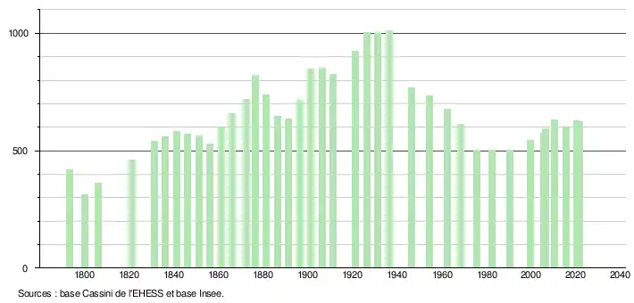 L'évolution du nombre d'habitants est connue à travers les recensements de la population effectués dans la commune depuis 1793. Pour les communes de moins de 10 000 habitants, une enquête de recensement portant sur toute la population est réalisée tous les cinq ans, les populations légales des années intermédiaires étant quant à elles estimées par interpolation ou extrapolation[20]. Pour la commune, le premier recensement exhaustif entrant dans le cadre du nouveau dispositif a été réalisé en 2005[21].