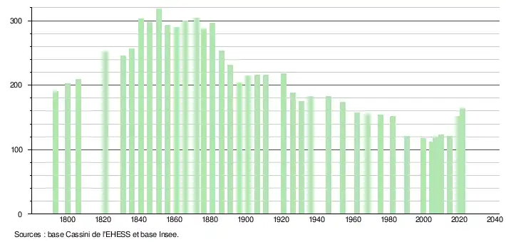L'évolution du nombre d'habitants est connue à travers les recensements de la population effectués dans la commune depuis 1793. Pour les communes de moins de 10 000 habitants, une enquête de recensement portant sur toute la population est réalisée tous les cinq ans, les populations légales des années intermédiaires étant quant à elles estimées par interpolation ou extrapolation[20]. Pour la commune, le premier recensement exhaustif entrant dans le cadre du nouveau dispositif a été réalisé en 2004[21].