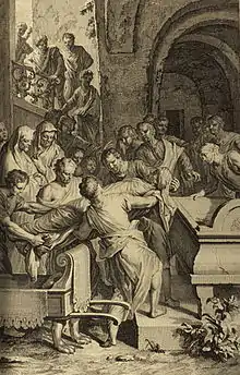 Isaac et Ismaël placent leur père Abraham dans son caveau, tel Gen. 25:9. Illustration G. Hoet (1728).