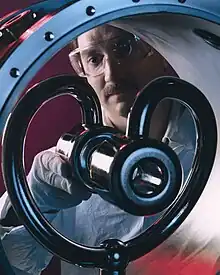 Deux cavités micro-ondes datant de 1955, chacune reliée par un guide d'ondes, à un klystron reflex (à gauche) et à un tube à vide (à droite) utilisés pour générer des micro-ondes. Les cavités servent de résonateurs (circuit bouchon ou réservoir ou en anglais : tank circuit) pour déterminer la fréquence des oscillateurs.
