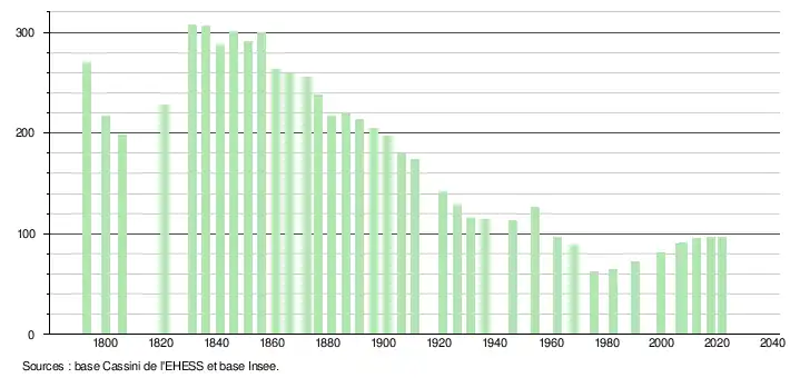 L'évolution du nombre d'habitants est connue à travers les recensements de la population effectués dans la commune depuis 1793. Pour les communes de moins de 10 000 habitants, une enquête de recensement portant sur toute la population est réalisée tous les cinq ans, les populations légales des années intermédiaires étant quant à elles estimées par interpolation ou extrapolation[44]. Pour la commune, le premier recensement exhaustif entrant dans le cadre du nouveau dispositif a été réalisé en 2007[45].