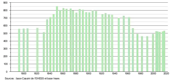 L'évolution du nombre d'habitants est connue à travers les recensements de la population effectués dans la commune depuis 1793. Pour les communes de moins de 10 000 habitants, une enquête de recensement portant sur toute la population est réalisée tous les cinq ans, les populations légales des années intermédiaires étant quant à elles estimées par interpolation ou extrapolation[8]. Pour la commune, le premier recensement exhaustif entrant dans le cadre du nouveau dispositif a été réalisé en 2004[9].
