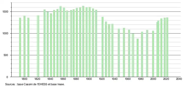 L'évolution du nombre d'habitants est connue à travers les recensements de la population effectués dans la commune depuis 1793. Pour les communes de moins de 10 000 habitants, une enquête de recensement portant sur toute la population est réalisée tous les cinq ans, les populations légales des années intermédiaires étant quant à elles estimées par interpolation ou extrapolation[32]. Pour la commune, le premier recensement exhaustif entrant dans le cadre du nouveau dispositif a été réalisé en 2007[33].