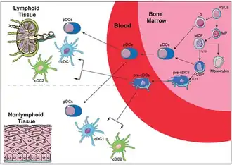 Les cellules dendritiques proviennent d'un précurseur hématopoïétique CD34+ qui donne naissance à des précurseurs myéloïdes et lymphoïdes. Les précurseurs myéloïdes se différencient en précurseurs de monocytes, de macrophages et de cellules dendritiques, qui donneront naissance aux monocytes et aux précurseurs communs des cellules dendritiques. Le précurseurs communs des cellules dendritiques peut se différencier en cellules dendritiques plasmacytoïdes ou en cellules dendritiques préconventionnelles. Les cellules dendritiques préconventionnelles sont les progéniteurs des deux principales sous-populations de cellules dendritiques nommées cellules dendritiques de type 1 et cellules dendritiques de type 2 [4]. Le séquençage de l'ARN permet une meilleure compréhension de l'ontogenèse des cellules dendritiques et l'identification des précurseurs du sous-ensemble des cellules dendritiques dans le sang périphérique [5], démontrant que l'engagement avec un sous-ensemble de cellules dendritiques peut être un événement précoce chez les humains [6].