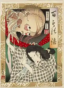 L'histoire était à l'origine une pièce de théâtre kabuki appelée Yotsuya kaidan, écrite en 1825 par Tsuruya Nanboku IV[8]. Il en existe plusieurs versions. La plus commune commence avec une jeune fille appelée Oume, qui tombe amoureuse d'un samouraï marié Tamiya Iemon. Ses amis tentent de se débarrasser de sa femme Oiwa en lui offrant une crème pour le visage empoisonnée. Cette attaque ne la tue pas mais abîme son visage. Iemon l'abandonne de dégoût, ce qui l'enrage de chagrin. Hystérique, elle trébuche et tombe sur une épée dégainée. Dans un dernier souffle elle maudit Iemon puis prend différentes formes pour le hanter, en particulier celle d'une lanterne de papier[7].