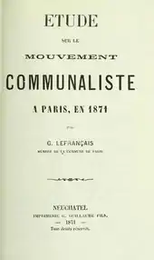 L'histoire de la Commune de Paris est écrite dès sa chute en 1871. Elle devient un objet d'études de l'histoire de gauche, puis marxiste durant l'entre-deux-guerres (initiée par l'essai de Karl Marx La Guerre civile en France[74]), particulièrement à propos des thèmes économiques et sociaux. Les années 1950 à 1970 marquent le principal effort académique collectif. La problématique est alors de positionner la Commune dans l'histoire du mouvement ouvrier : est-elle le « crépuscule » des révolutions françaises du XIXe siècle ou l'« aurore » du mouvement ouvrier moderne[75] ? Elle serait alors le jalon qui relierait l'abandon de l'idée républicaine et l'avènement du socialisme[76]. Les historiens scrutent ses idéologies, ses personnalités, ses réalisations, et lui cherchent une avant-garde (que pourrait incarner l'Association internationale des travailleurs, AIT), ainsi qu'un rôle dans le passage à l'international des mouvements décriés comme « romantiques » à la lutte politique moderne[pas clair]. Ainsi, la recherche s'internationalise et voit l'investissement de scientifiques d'autres pays d'Europe ou des États-Unis[75]. En dépit de leur orientation politique, ces recherches permettent d'établir des connaissances et des données importantes sur les communards et les débats internes à la Commune, ainsi que de mettre fin à certaines idées reçues[75],[76]. Plus tardives, les recherches davantage influencées par l'anarchisme, mettent en avant la spontanéité du mouvement révolutionnaire[76],[32].