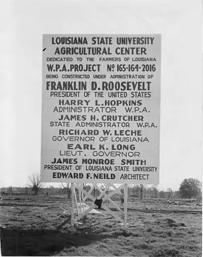 Panneau de construction de la Work Projects Administration pour le centre agronomique de l'université d'État de Louisiane (1936).